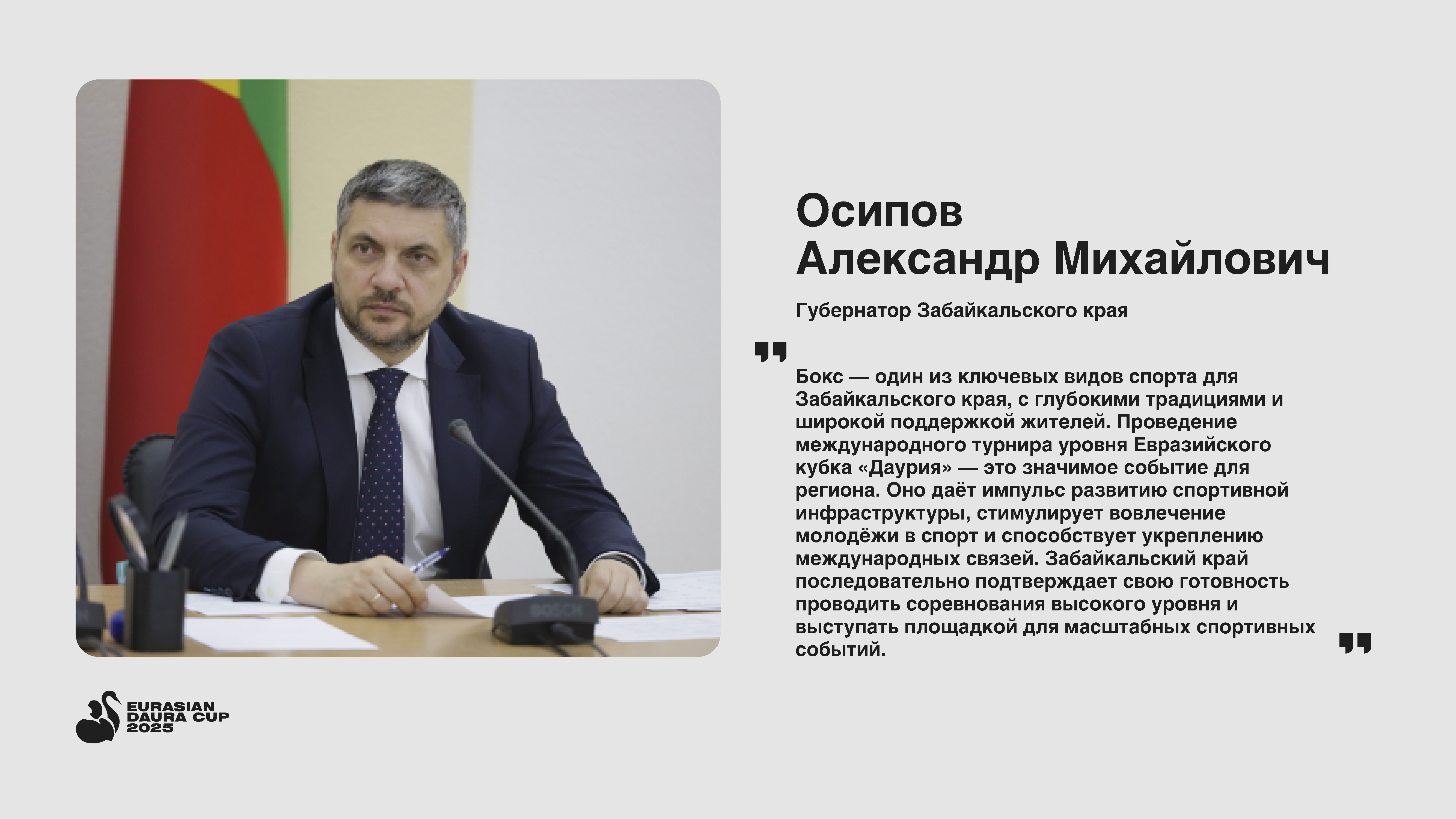 От имени нашей группы ОКТО, ГРК "ЗАПАДНАЯ" хочу поблагодарить организаторов, Дмитрия Сергеевича Ефименкова, конечно же, Губернатора Забайкальского края Александра Михайловича Осипова за возможность помочь в проведении II Международного турнира по боксу «Евразийский кубок «Даурия». Это большая честь для нас. Всех поздравляю с завершающим днём этого прекрасного турнира! Я желаю всем спортсменам успешных боёв, и конечно же, болеем за наших!»