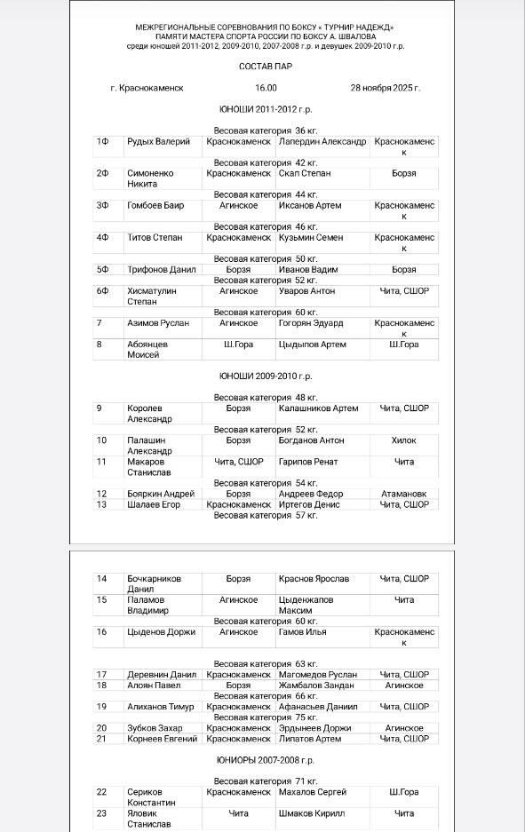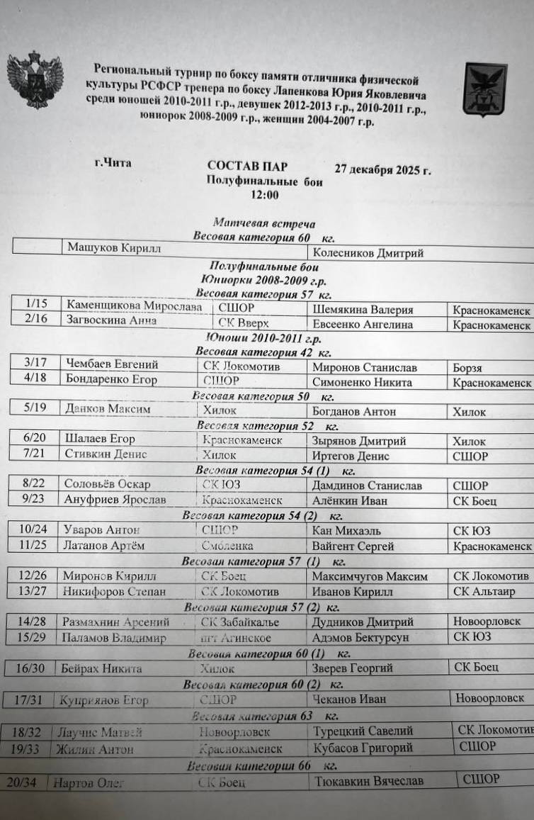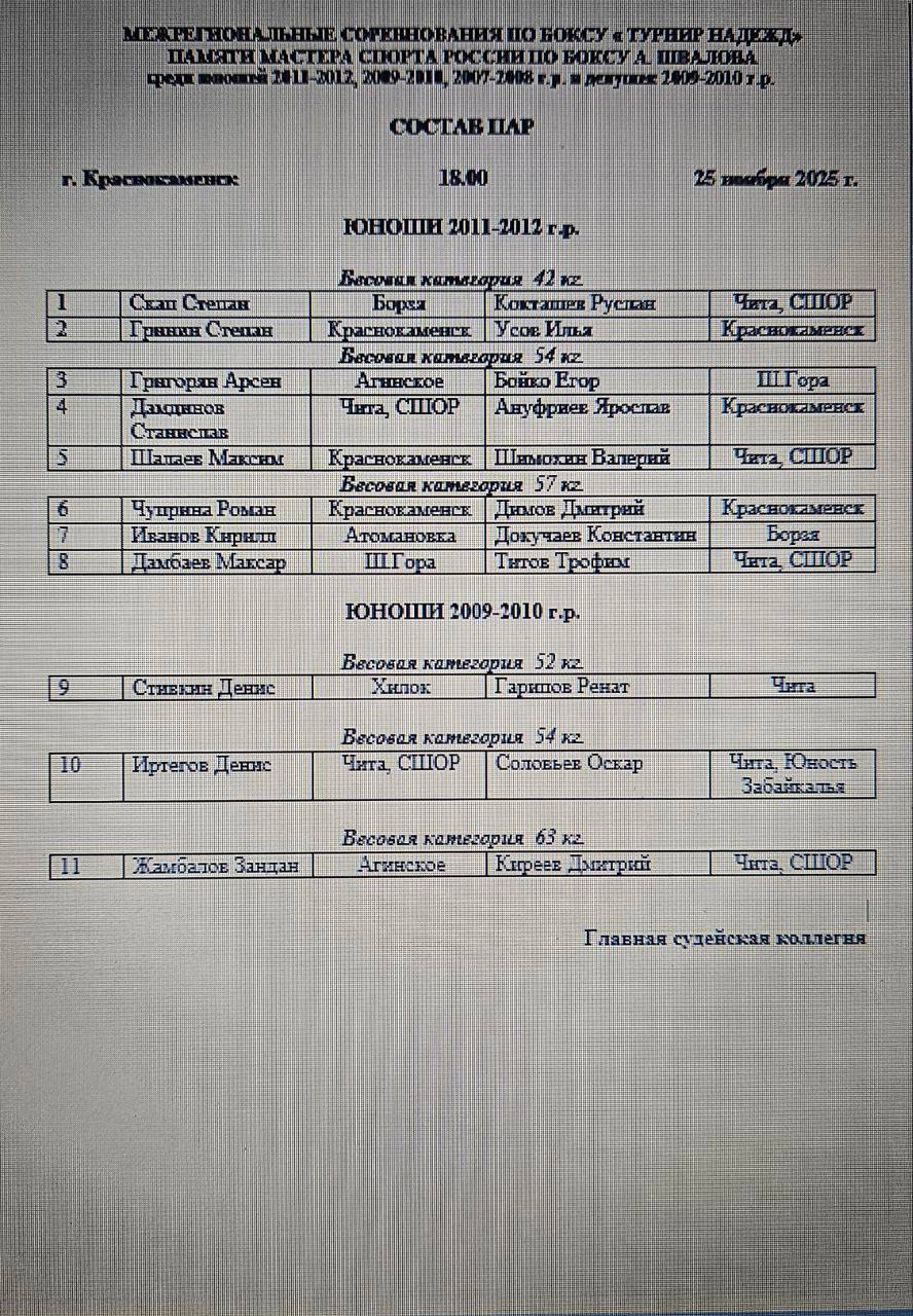 Состав пар на полуфинал региональных соревнований по боксу среди юношей 2010-2011 г.р. и девушек всех возрастов к 90-летию со дня рождения Юрия Яковлевича Лапенкова🏆🥊