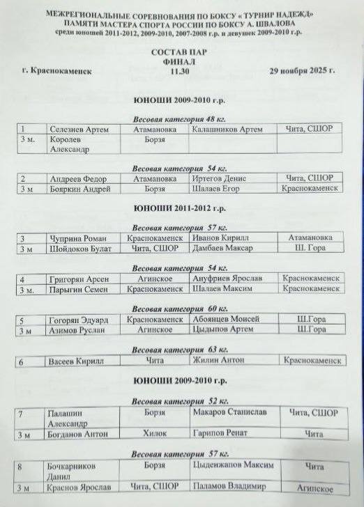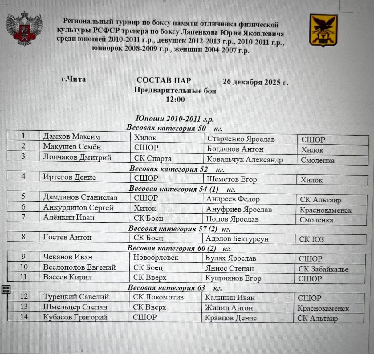 Состав пар на финал региональных соревнований по боксу среди юношей 2010-2011 г.р. и девушек всех возрастов к 90-летию со дня рождения Юрия Яковлевича Лапенкова🏆🥊