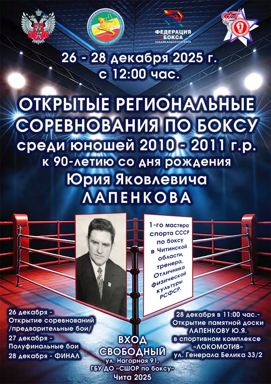 В период с 26 по 28 декабря в ГБУ ДО «СШОР по боксу» Забайкальского края пройдут региональные соревнования по боксу среди юношей 2010-2011 г.р. и девушек всех возрастов к 90-летию со дня рождения Юрия Яковлевича Лапенкова🏆🥊