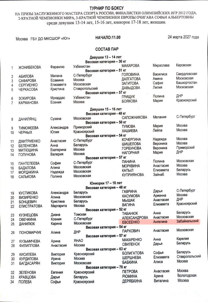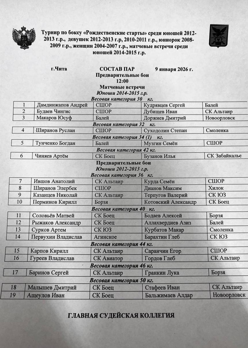 Состав пар на первый день турнира по боксу «Рождественские старты», среди юношей 2012-2013 г.р., девушек всех возрастов и матчевые встречи среди юношей 2014-2015 г.р.🏆
