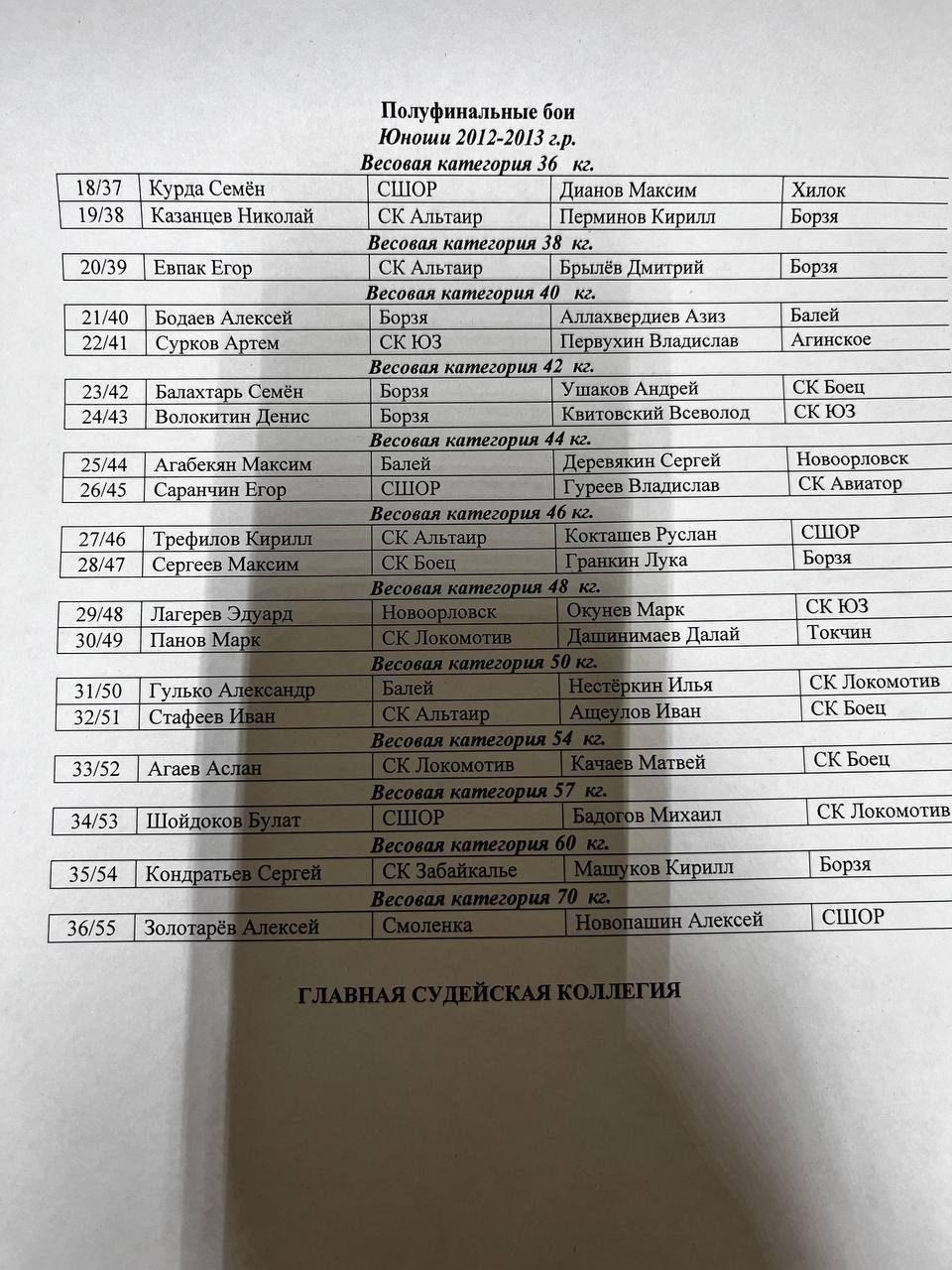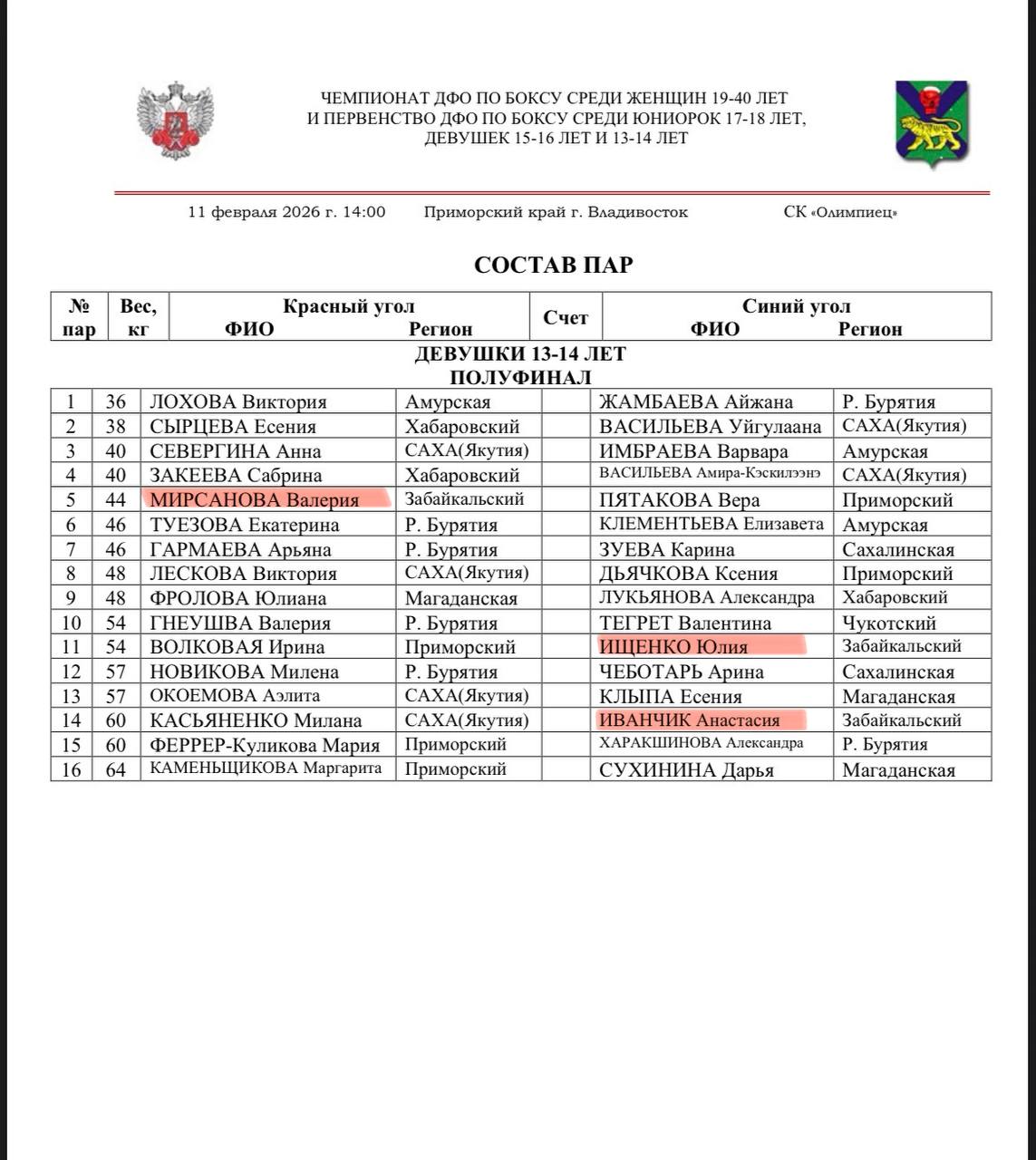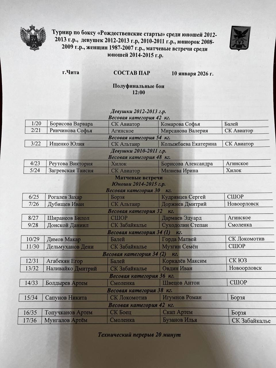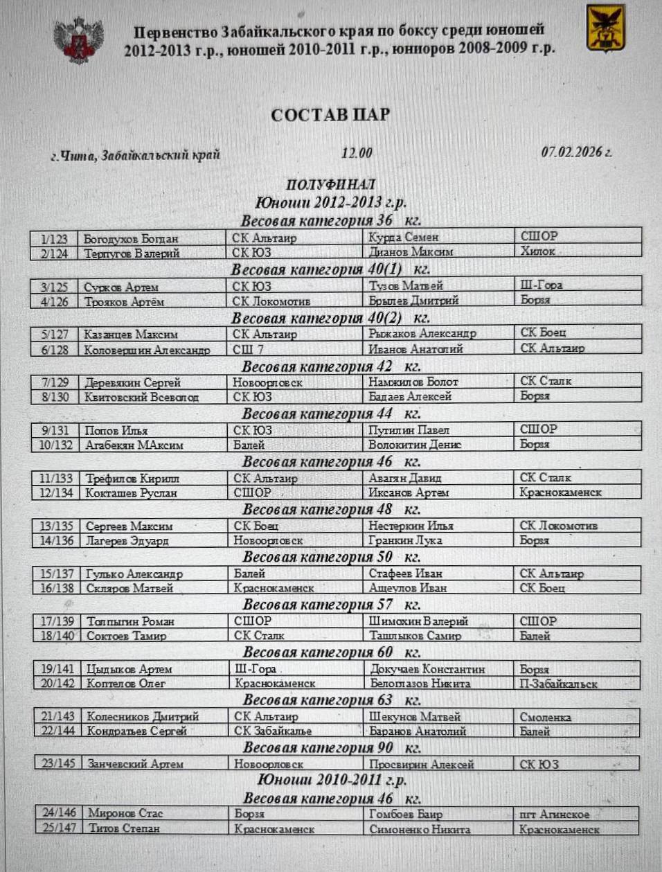 Состав пар на полуфинал турнира по боксу «Рождественские старты», среди юношей 2012-2013 г.р., девушек всех возрастов и матчевые встречи среди юношей 2014-2015 г.р.🏆