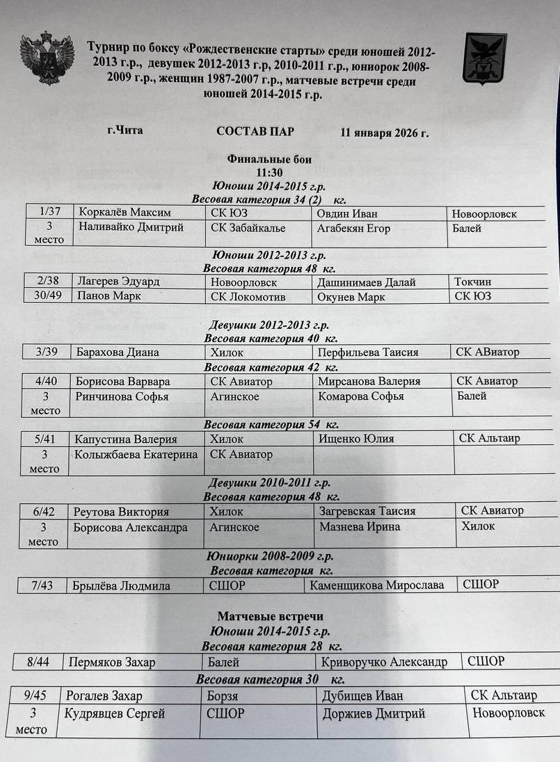 Состав пар на финал турнира по боксу «Рождественские старты», среди юношей 2012-2013 г.р., девушек всех возрастов и матчевые встречи среди юношей 2014-2015 г.р.🏆