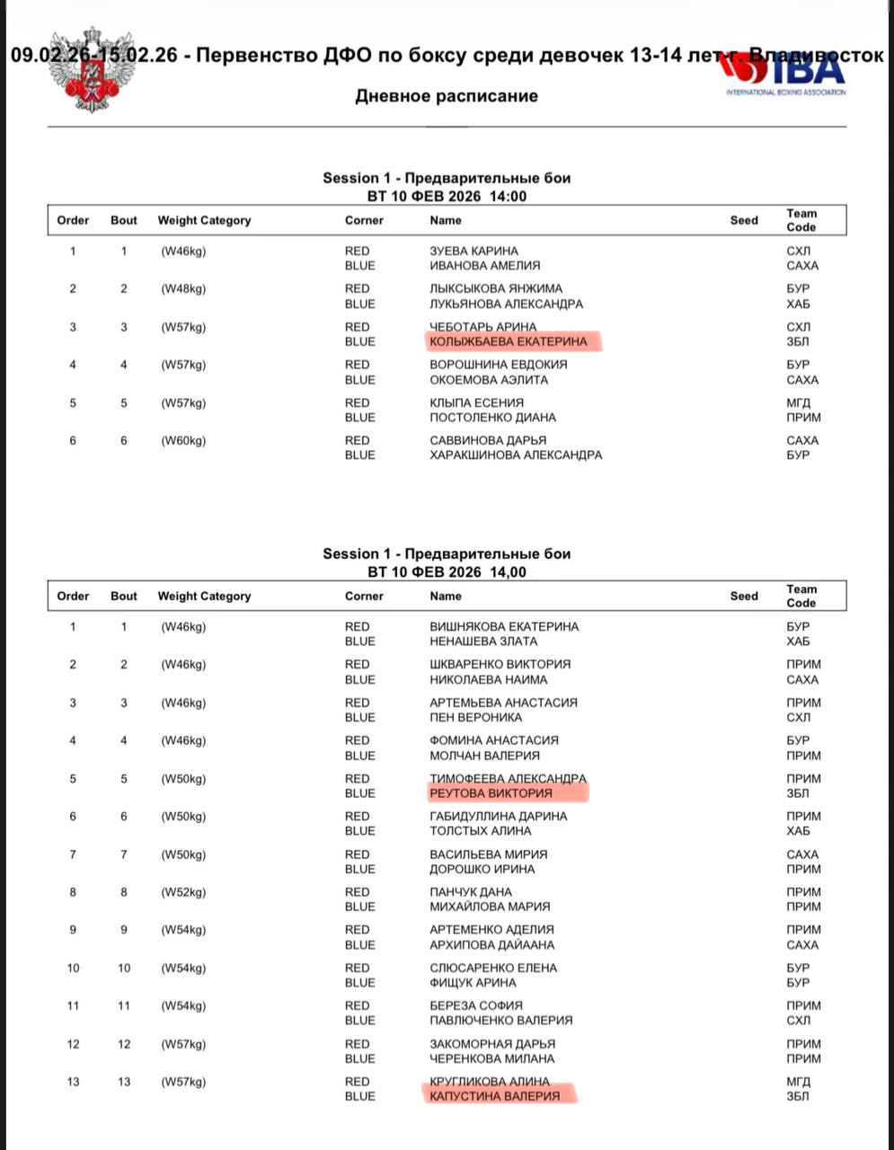 🥊Состав пар на второй день первенства Дальневосточного федерального округа по боксу среди: