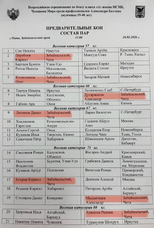 • Братья Перебоевы — Алексей и Кирилл, Егор Корчагин, Даниил Логинов, Александр Мадыгмаев, Алексей Денисов, Даниил Соколик, Евгений Таскин, Александр Дугаржапов, Ренат Аттокуров, Рамзан Ахматов, Сергей Лимков, Евгений Чаплыгин, Владимир Мироманов, Мухаммад-Хабиб Джамаев, Курбан Байранбеков — готовятся к принципиальному выступлению.