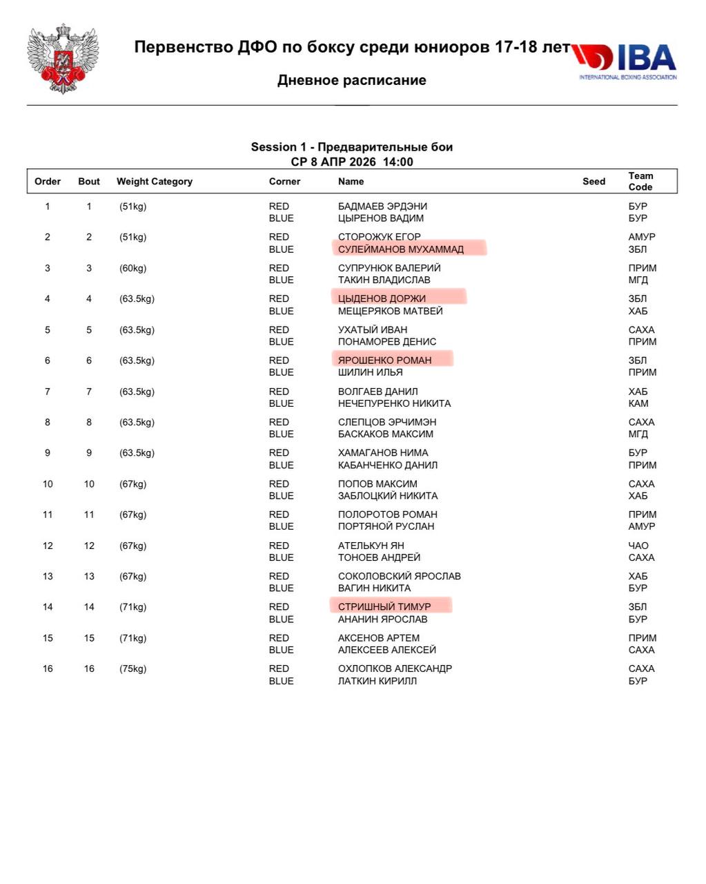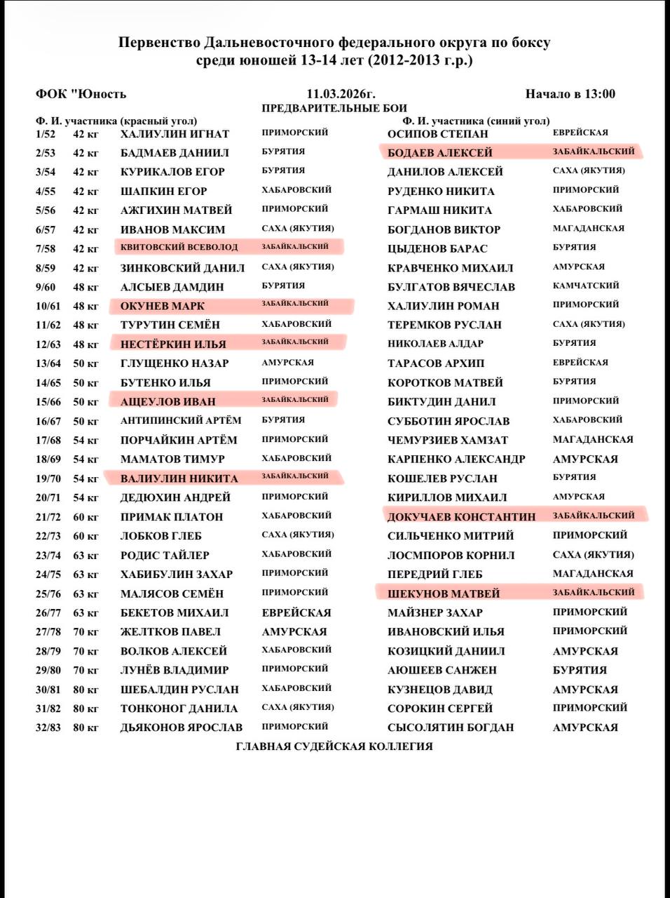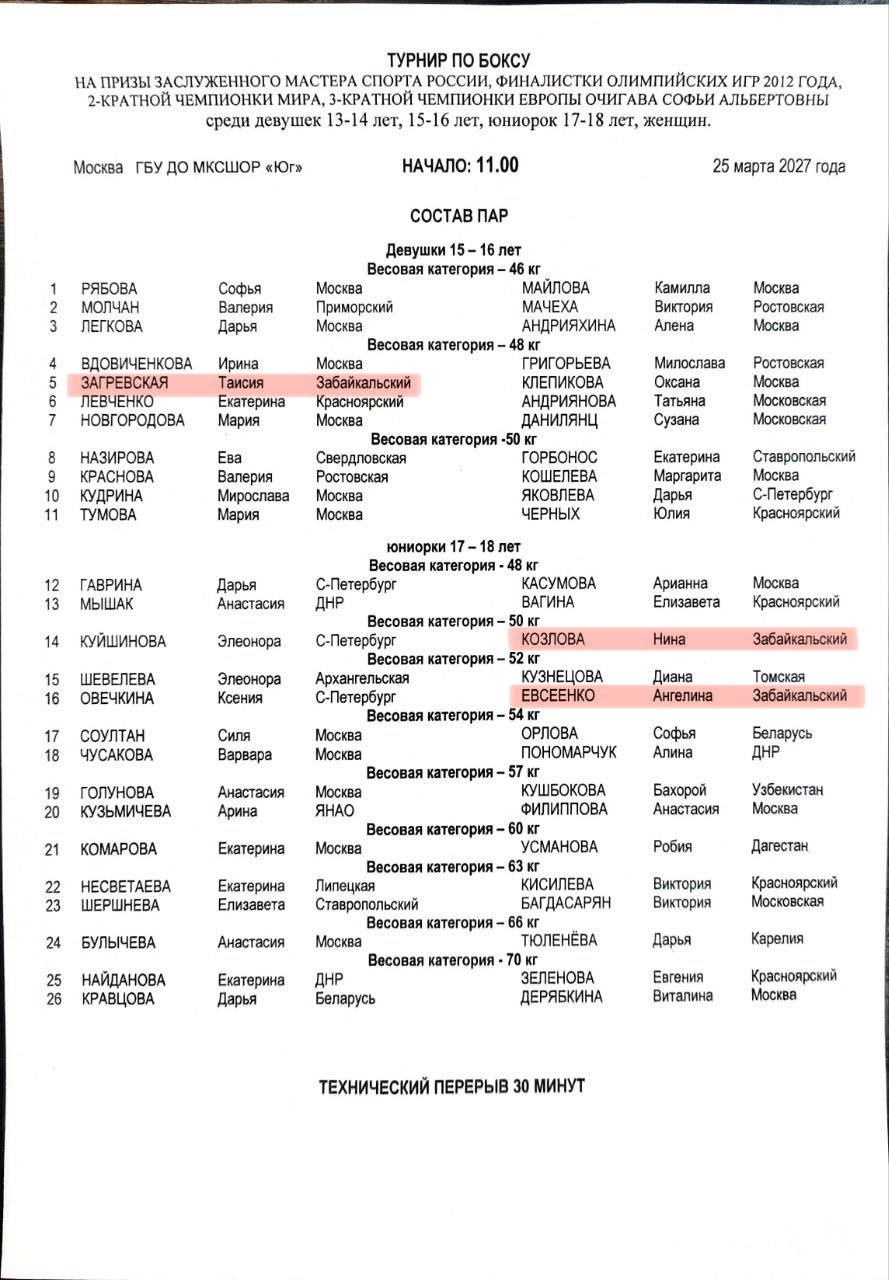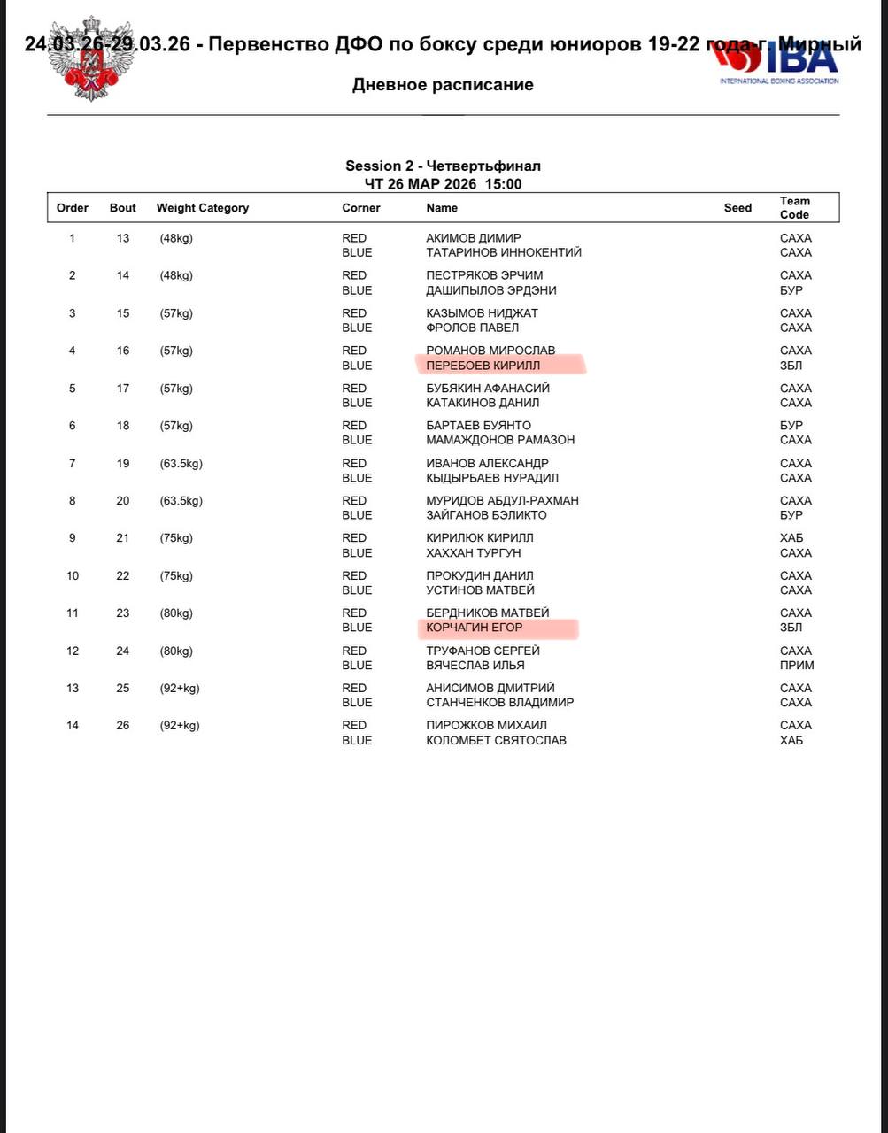 🥊Регламент и состав пар на первый день соревнований.