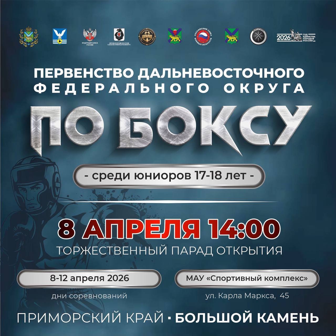 8 апреля в городе Большой Камень(Приморский край), стартует первенство Дальневосточного федерального округа по боксу среди юниоров 17-18 лет🏆